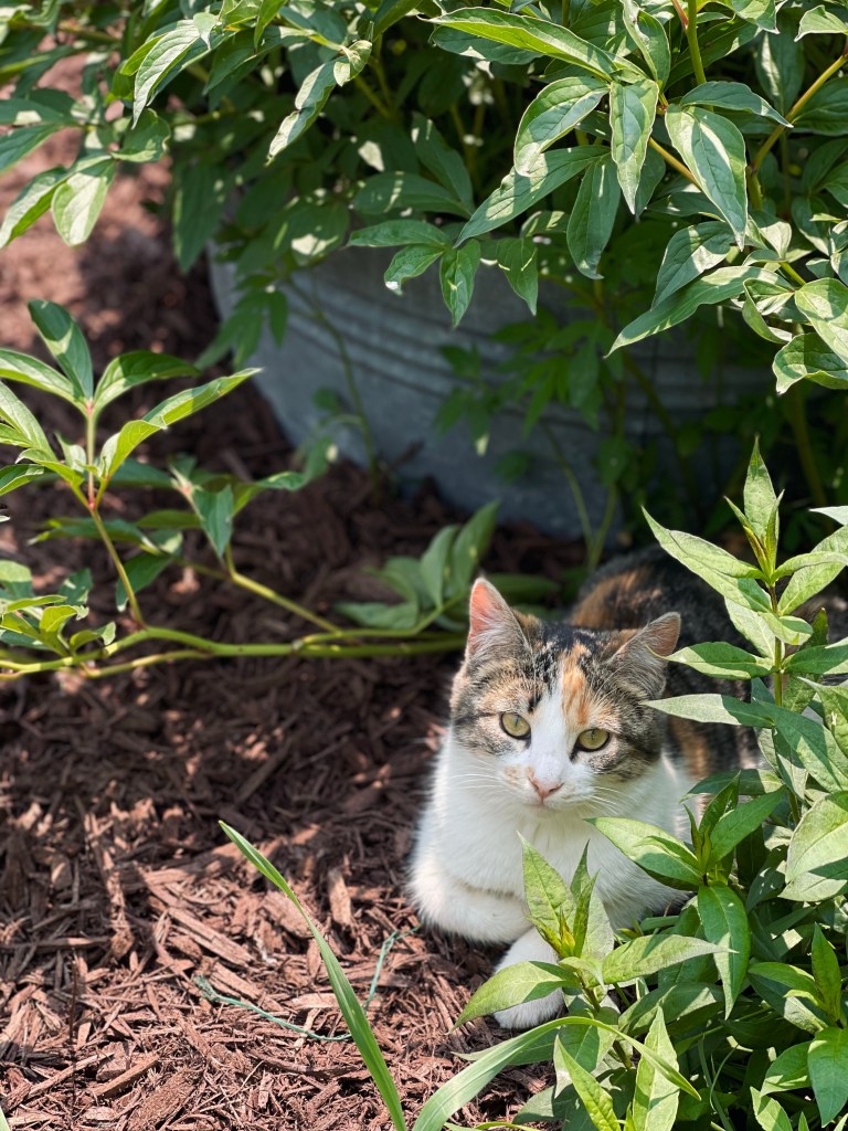 Here is our kids’ kitten “Tiny” (not so tiny anymore) hanging out in her cozy spot beneath the peonies. We just did some more work in the flower beds, pulling out the sunken rock border and laying fresh mulch. It’s still not perfect, but looking a lot better!