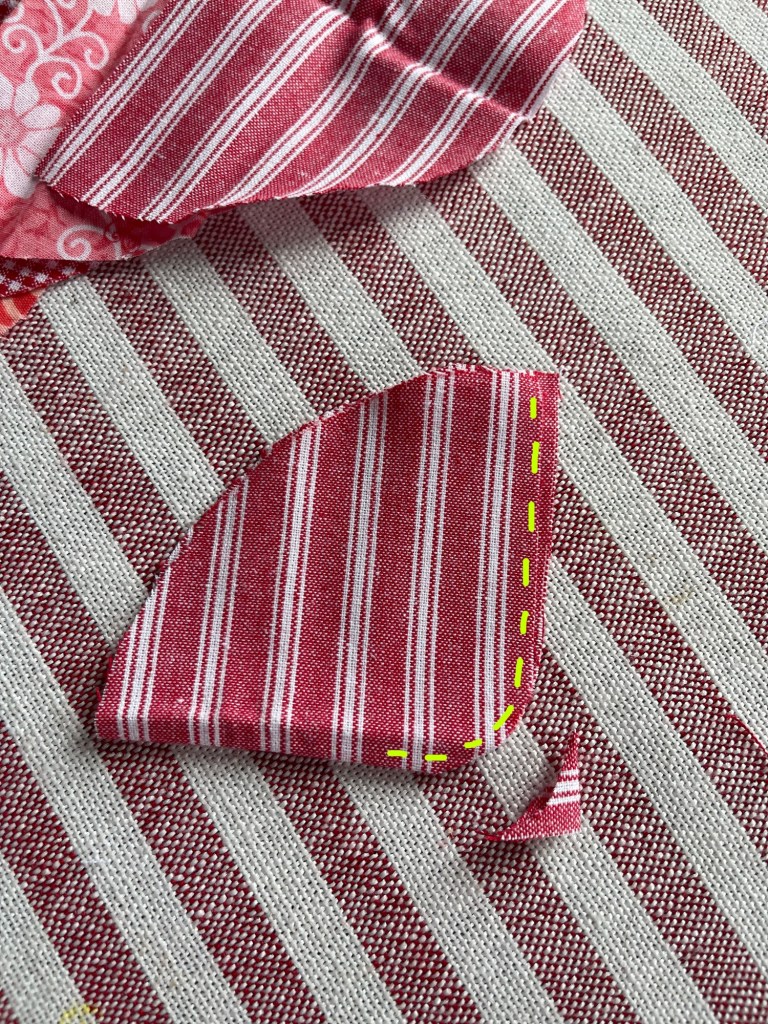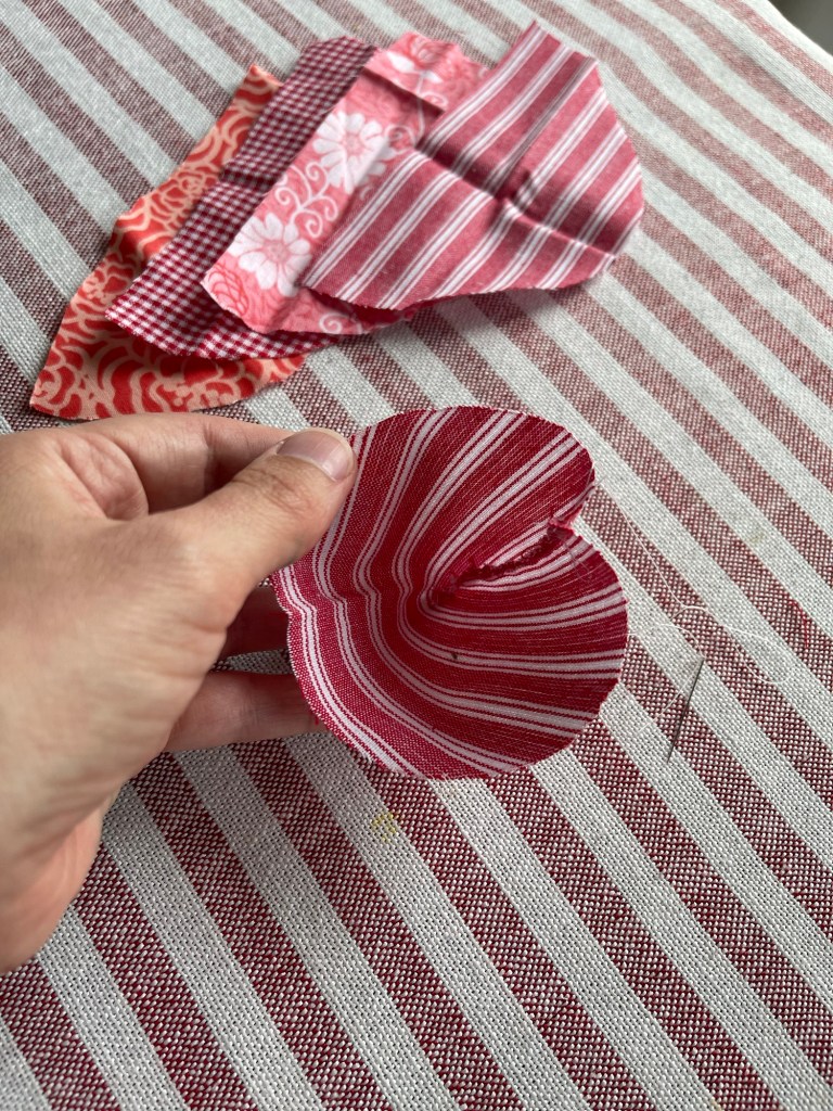 Take one of the pieces and fold it in half, right side together. Cut the bottom corner a bit if you want the strawberry to be more round at the bottom.