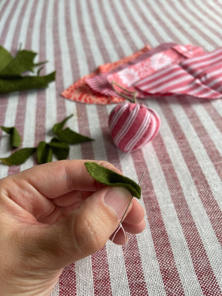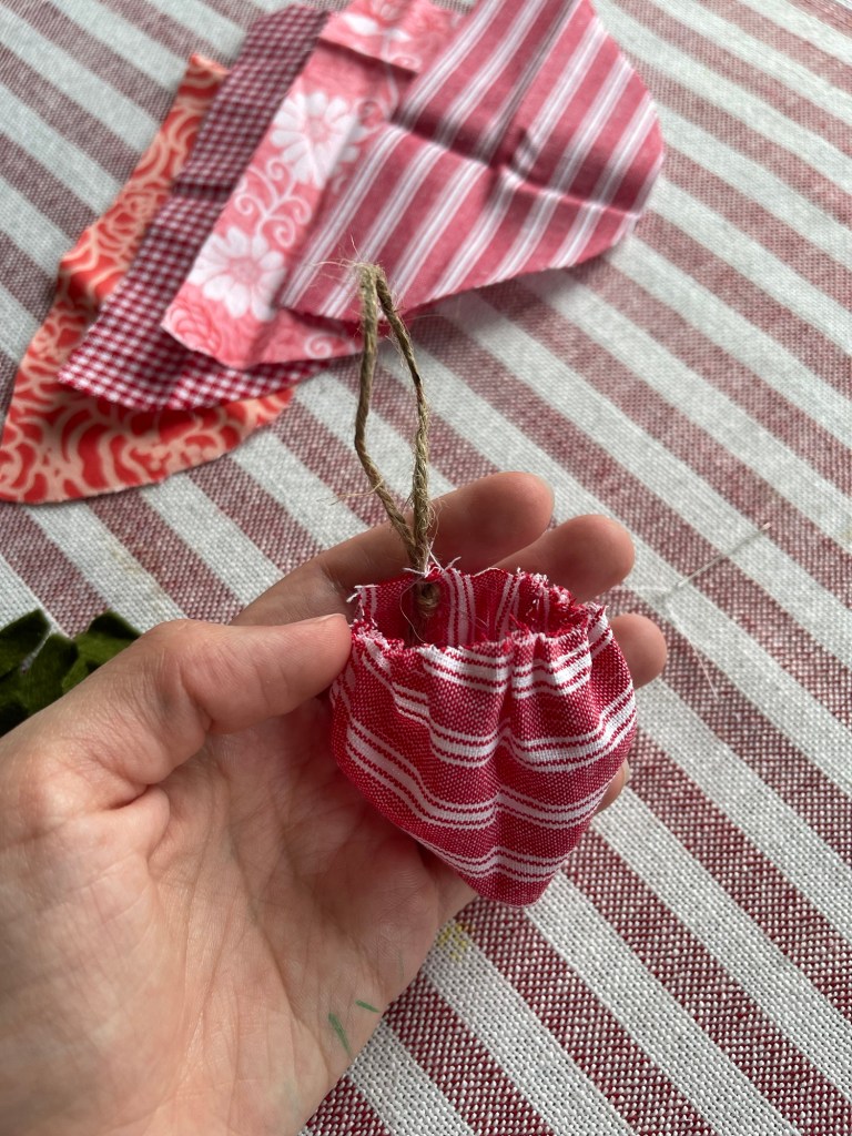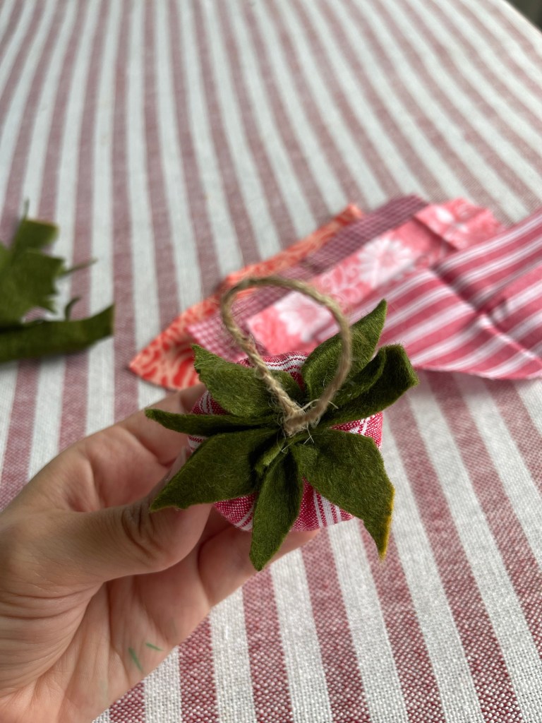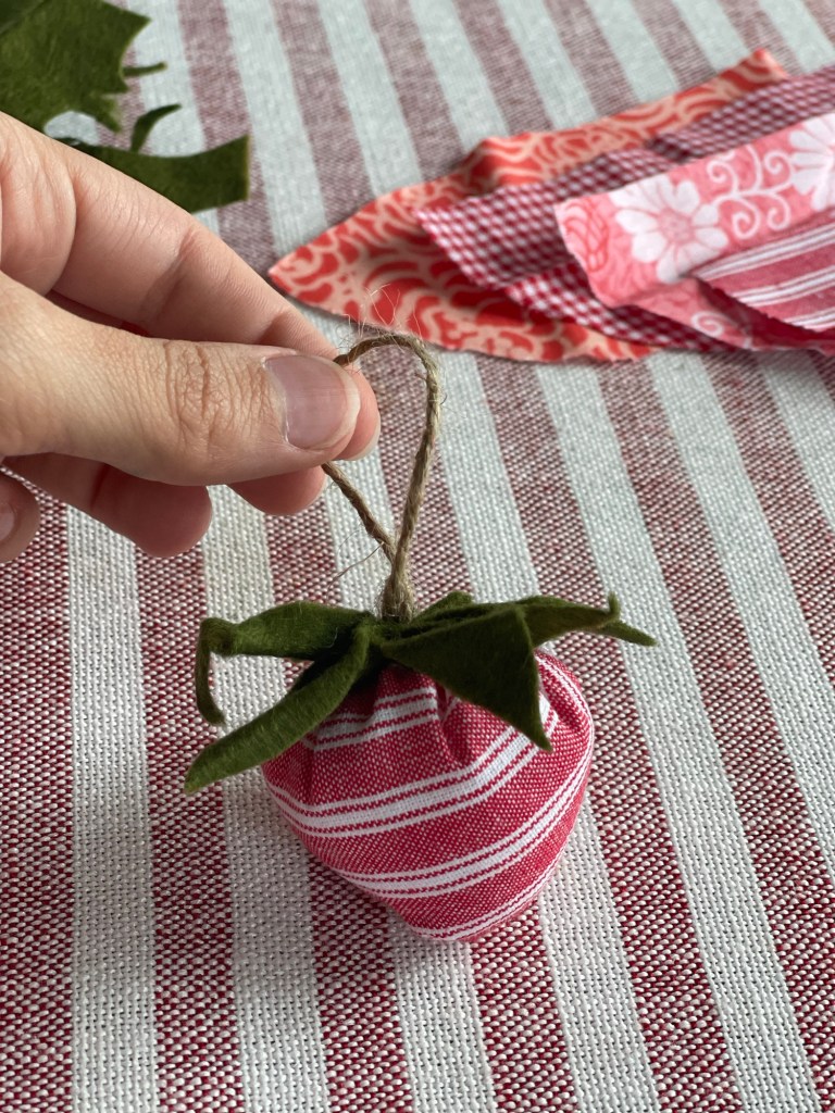 Voila! Stitch them into place tightly and tie it securely, and we have an adorable handmade strawberry!